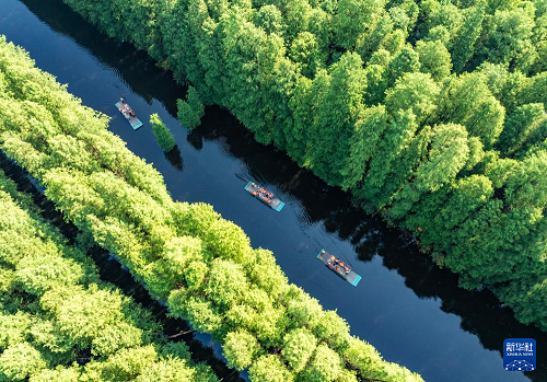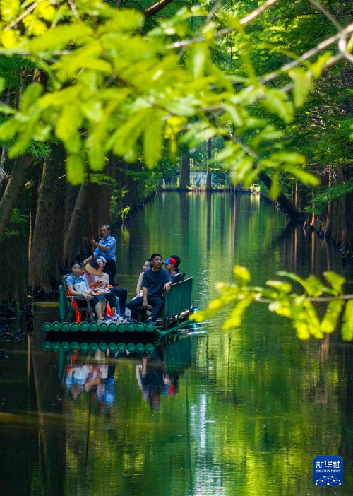 8月30日,游人在江蘇省淮安市金湖縣水上森林景區(qū)乘坐竹筏游覽美景(無人機(jī)照片)。(新華社發(fā) 周社根 攝)