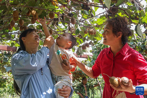 8月31日,游客在河南省平頂山市寶豐縣鬧店鎮(zhèn)小張莊村一家獼猴桃種植園采摘。(新華社發(fā) 何五昌 攝)