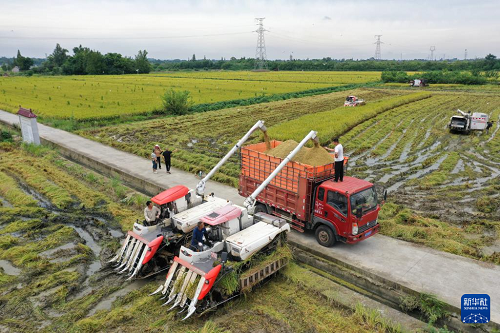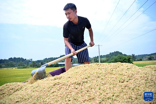 9月1日,在四川省內(nèi)江市東興區(qū)田家鎮(zhèn)趙家壩社區(qū),農(nóng)機(jī)手在水稻搶收現(xiàn)場裝車。(新華社發(fā) 李建明 攝)