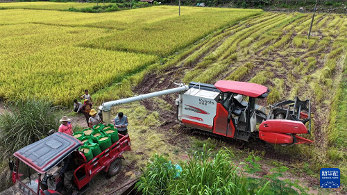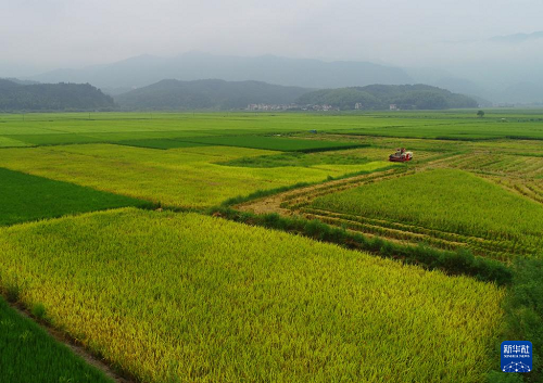 8月31日,在福建省南平市浦城縣仙陽鎮(zhèn),村民駕駛收割機(jī)在田間作業(yè)(無人機(jī)照片)。(新華社發(fā) 黃杰敏 攝)