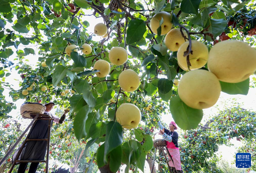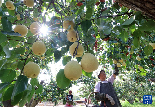 9月11日,河北省晉州市周家莊鄉(xiāng)第七生產(chǎn)隊農(nóng)民在梨園采收鴨梨。(新華社記者 楊世堯 攝)