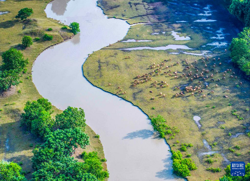 9月11日,在江蘇省泰州市姜堰區(qū)溱湖國(guó)家濕地公園,一群麋鹿在覓食、嬉戲(無(wú)人機(jī)照片)。(新華社發(fā) 周社根 攝)