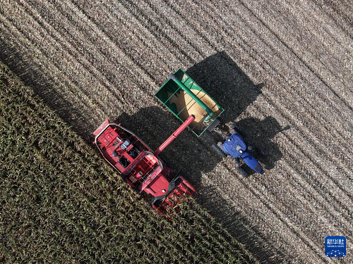 9月23日,在黑龍江北大荒農(nóng)業(yè)股份有限公司友誼分公司一旱田地塊,大型農(nóng)業(yè)機(jī)械在進(jìn)行玉米收獲作業(yè)(無(wú)人機(jī)照片)。(新華社記者 王松 攝)