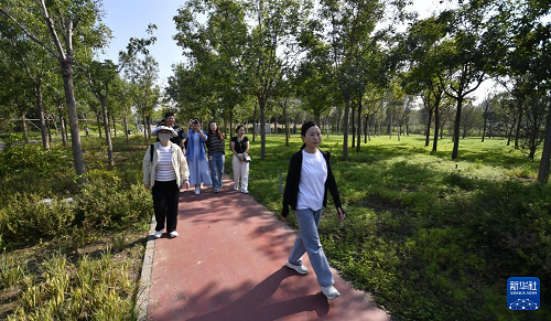 9月24日,市民在順義區(qū)后沙峪鎮(zhèn)的溫榆河公園內(nèi)的步道上運(yùn)動。(新華社記者 李欣 攝)