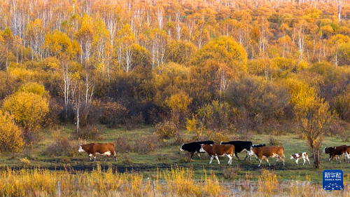 9月25日,在內(nèi)蒙古呼倫貝爾市額爾古納市恩和俄羅斯族民族鄉(xiāng),牛群在林間吃草(無人機(jī)照片)。(新華社記者 馬金瑞 攝)