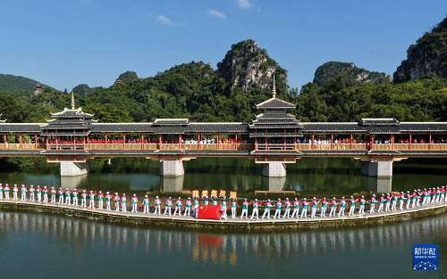 9月28日,在廣西柳州市龍?zhí)豆珗@,人們共同唱響《我和我的祖國》(無人機照片)。(新華社發(fā) 黎寒池 攝)