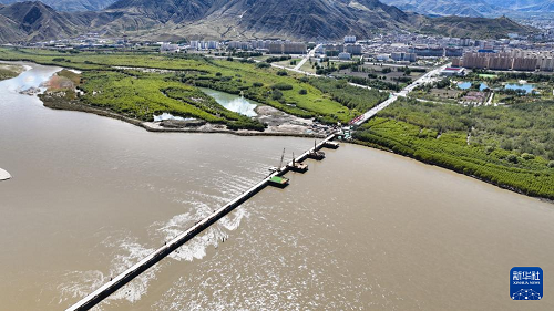 建設(shè)中的薩熱路跨江大橋(無人機(jī)照片,9月26日攝)。(新華社記者 晉美多吉 攝)