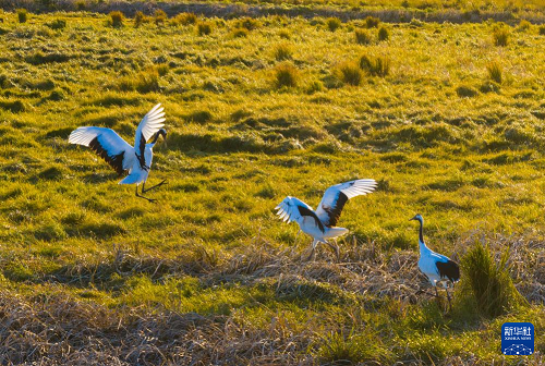 10月9日,在黑龍江撓力河國(guó)家級(jí)自然保護(hù)區(qū),丹頂鶴在濕地中活動(dòng)(無人機(jī)照片)。(新華社發(fā) 韓陽 攝)