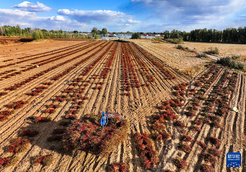 10月19日,在通遼市開魯縣東風(fēng)鎮(zhèn)六合堂村,村民在田地里收獲干椒(無人機(jī)照片)。(新華社記者 連振 攝)