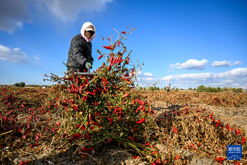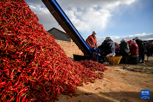 10月19日,在通遼市開魯縣東風(fēng)鎮(zhèn)六合堂村,村民在分揀紅干椒。(新華社記者 連振 攝)