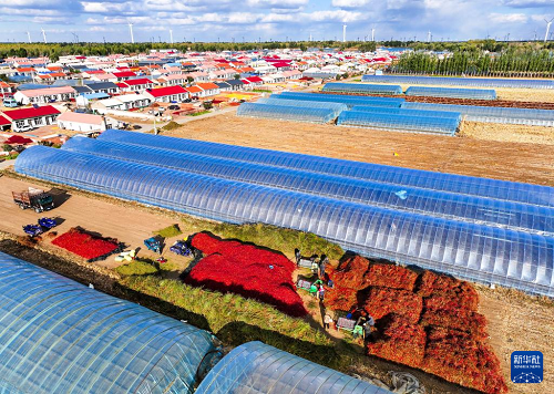 10月19日,在通遼市開魯縣東風(fēng)鎮(zhèn)六合堂村,村民在分揀紅干椒(無人機(jī)照片)。(新華社記者 連振 攝)