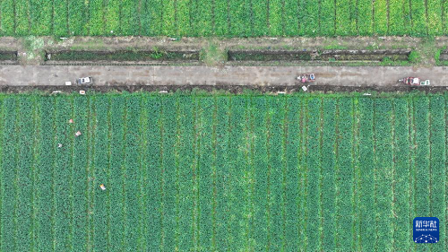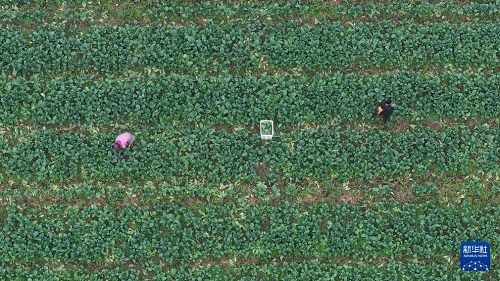 10月30日,菜農(nóng)在沅江市草尾鎮(zhèn)樂園村蔬菜田里采收蔬菜(無人機照片)。(新華社記者 陳振海 攝)