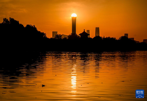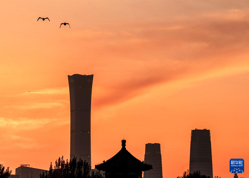 11月10日清晨,北京上空晨曦微露,霞光滿天。中國尊、望海樓等地標建筑在晨光中與什剎海光影交錯。