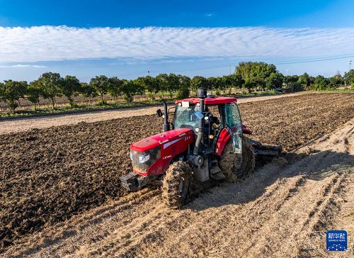 11月11日,江蘇省興化市陳堡鎮(zhèn)寧鄉(xiāng)村農(nóng)民駕駛農(nóng)機(jī)耕地,為冬小麥播種做準(zhǔn)備(無人機(jī)照片)。(新華社發(fā) 周社根 攝)