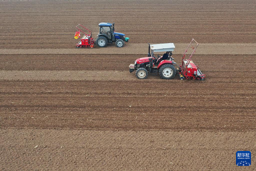 11月11日,河南省焦作市溫縣黃莊鎮(zhèn)常莊村村民駕駛播種機(jī)在田間播種小麥(無人機(jī)照片)。(新華社發(fā) 徐宏星 攝)