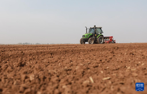 11月11日,農(nóng)民駕駛農(nóng)機(jī)在河南省焦作市溫縣黃河灘區(qū)播種小麥。(新華社發(fā) 黃福興 攝)