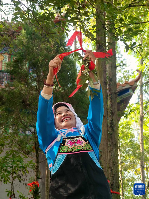 10月29日重陽(yáng)節(jié),廣西南丹縣群眾按照傳統(tǒng)習(xí)俗在樹(shù)木上懸掛福壽帶。(新華社發(fā) 高東風(fēng) 攝)