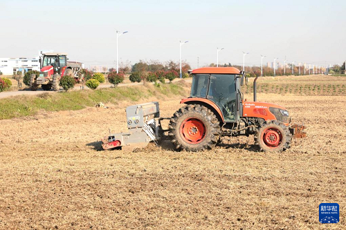 11月19日,在江蘇省常州市金壇區(qū)金城鎮(zhèn),農(nóng)機在田里播種小麥。(新華社發(fā) 陳暐 攝)