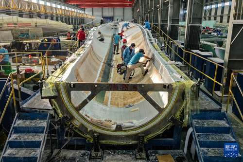 11月20日,在甘肅省酒泉經(jīng)濟(jì)技術(shù)開發(fā)區(qū)的甘肅九鼎風(fēng)電復(fù)合材料有限公司成型車間,工作人員進(jìn)行風(fēng)機(jī)葉片鋪層作業(yè)(無(wú)人機(jī)照片)。(新華社記者 郎兵兵 攝)