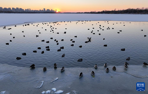 11月27日,一群綠頭鴨聚集在降雪后的松花江哈爾濱段未結(jié)冰水域覓食、休憩。落日金暉映照下,白雪、寒江和綠頭鴨組成了一幅寒江“戲雪”畫卷。