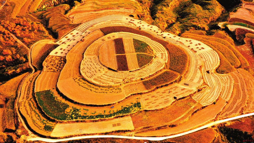 層層梯田滿目金黃,極目遠眺宛如畫卷。河曲縣鄉(xiāng)村錯落有致的梯田與曲折的道路相呼應,繪出一幅別致的田園風光畫。(何 帥 楊成林攝)