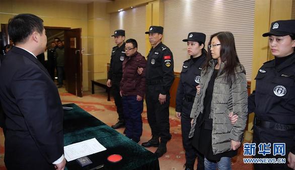 2月6日,在北京首都機(jī)場,檢察官向“百名紅通”嫌犯付耀波(右五)、張清曌(右二)宣讀相關(guān)法律文書。當(dāng)日,在中央追逃辦統(tǒng)一部署下,在外交部、公安部及我駐巴巴多斯、格林納達(dá)等駐外使館的大力協(xié)助下,遼寧省追逃辦組織協(xié)調(diào)檢察、公安等部門,成功將遠(yuǎn)逃至加勒比海島國圣文森特和格林納丁斯的“百名紅通”第39號嫌犯付耀波、第41號嫌犯張清曌同時(shí)抓獲歸案。新華社記者殷剛攝