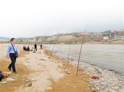 當(dāng)日下午3時許,蘭州晨報(bào)記者在雁白大橋西側(cè)的黃河岸邊看到12把魚竿一字排開,3名釣魚者坐在旁邊沙灘上正在等待魚兒上鉤,還有兩名中年男子正在周圍撒網(wǎng)。在相隔十多米處,記者發(fā)現(xiàn)還有兩名男子分別撐著魚竿釣魚,有一名捕魚者在撒網(wǎng)?!斑@是雙面粘漁網(wǎng),河內(nèi)稍大一些的魚兒只要撞進(jìn)網(wǎng)里就擺脫不了?!币幻遏~男子得意地說。