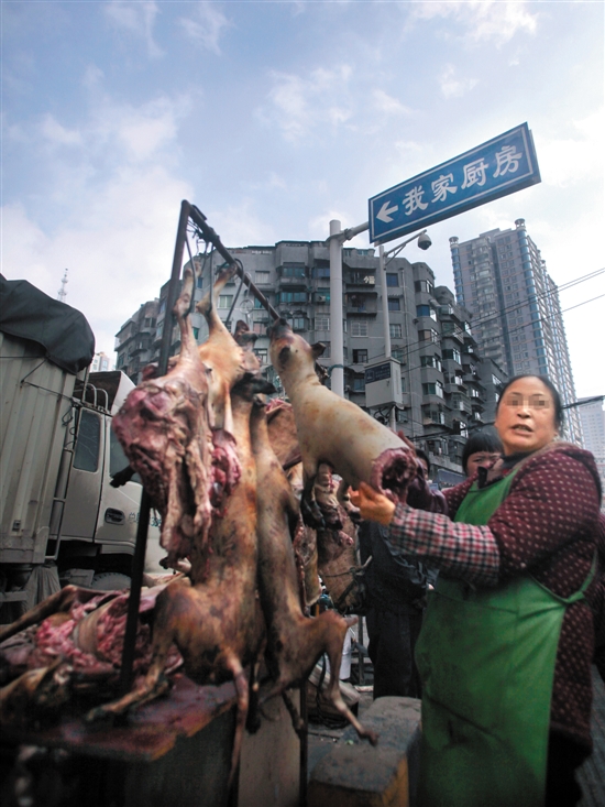 在貴陽市新路口菜市場(chǎng)上宰殺生狗、火燒狗皮,販賣狗肉的攤販一家接著一家