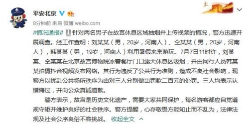 通報(bào)稱,經(jīng)工作查明:劉某某(男,20歲,河南人)、仝某某(男,20歲,河南人),韓某某(男,19歲,河南人)利用暑假來(lái)京游玩。7月7日11時(shí)許,劉某某、仝某某在北京故宮博物院冰窖餐廳門(mén)口露天休息區(qū)吸煙,并由同行人員韓某某拍攝抖音視頻發(fā)布網(wǎng)絡(luò)。其行為違反了公共行為準(zhǔn)則,造成不良社會(huì)影響,現(xiàn)警方以擾亂公共場(chǎng)所秩序?yàn)橛蓪?duì)三人分別做出罰款二百元的處罰。三人均表示認(rèn)錯(cuò)悔過(guò),并向公眾真誠(chéng)道歉。