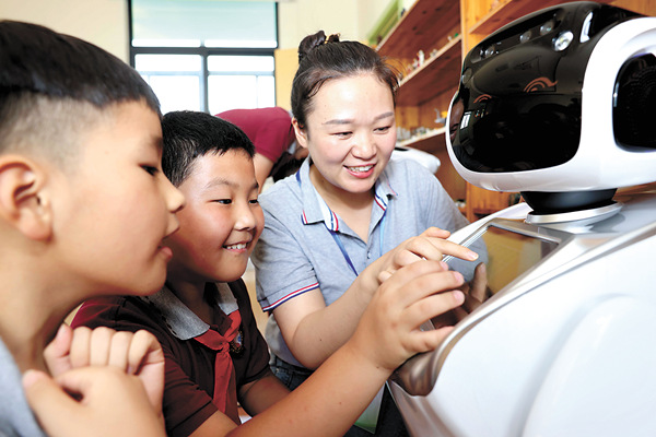 為緩解未成年人假期“看護難”問題,安徽省合肥市瑤海區(qū)試點免費提供音體美興趣培養(yǎng)、公益看護、讀書賞析、作業(yè)輔導、科技創(chuàng)新等為主要內(nèi)容的“五彩假日”托管和教育服務。圖為孩子們在和機器人做互動游戲。 新華社發(fā)(解琛 攝)