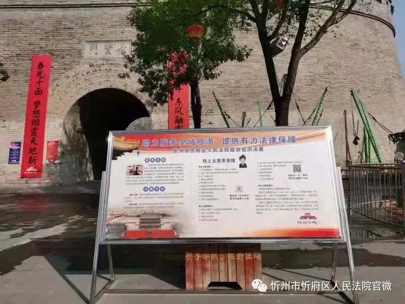 隨著我市旅游業(yè)迅猛發(fā)展,來自全國各地的游客不斷增加,為更好地助力忻府區(qū)旅游業(yè)提檔升級(jí),滿足人民日益增長的多元司法需求,國慶黃金周期間,忻府區(qū)法院在忻州古城內(nèi)設(shè)立旅游巡回法庭宣傳展板,為游客提供導(dǎo)訴指南服務(wù)。