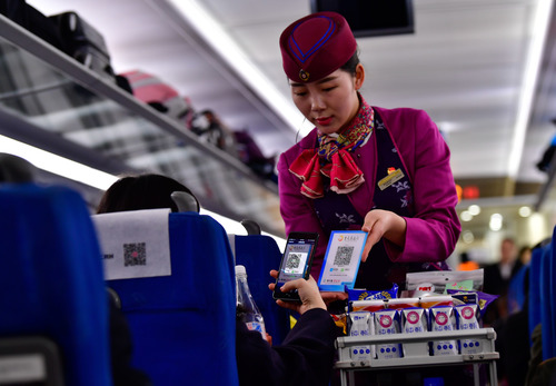 圖為在重慶客運(yùn)段G8516次列車(chē)上,一名旅客在使用手機(jī)掃碼支付購(gòu)買(mǎi)飲用水。新華社記者 劉潺 攝