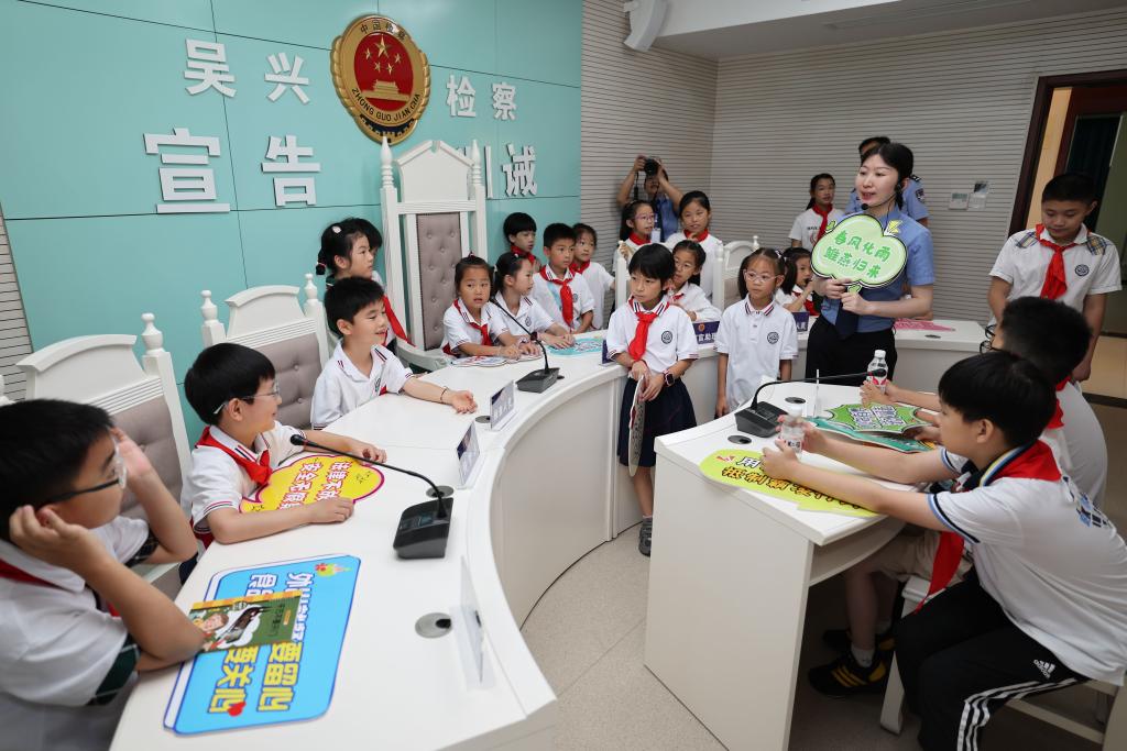 2024年7月3日,湖州市吳興區(qū)人民檢察院檢察官帶領(lǐng)小學生參觀未成年人檢察辦案區(qū)。新華社記者 黃宗治 攝