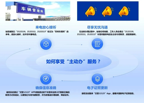為了確?!爸鲃?dòng)辦”服務(wù)的順利推進(jìn),忻州市公安局交警支隊(duì)還提醒用戶,請及時(shí)登錄“交管12123”App查看并更新電子證照信息,同時(shí)確保在車管所登記的聯(lián)系方式和地址準(zhǔn)確無誤。這樣,車管所不僅能夠及時(shí)與用戶溝通聯(lián)系,還能將辦理結(jié)果和證件準(zhǔn)確無誤地寄送到用戶手中。