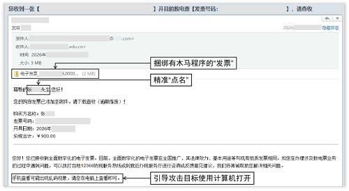 “【電子發(fā)票】張某某先生,您的發(fā)票已開好,請點(diǎn)擊下載”——當(dāng)收件箱彈出這類帶著你真實(shí)姓名的電子郵件,你是否會(huì)下意識點(diǎn)擊?注意!這可能是境外間諜情報(bào)機(jī)關(guān)實(shí)施的精準(zhǔn)網(wǎng)絡(luò)攻擊。一旦點(diǎn)擊郵件中的附件或者鏈接,設(shè)備將瞬間淪為間諜竊密的“突破口”,安全風(fēng)險(xiǎn)隨之而來。
