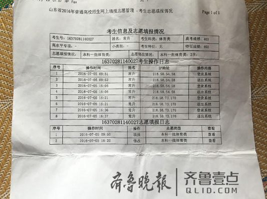 記者注意到,常升在7月5日上午9點(diǎn)51分登陸自己的賬號填報好了志愿之后便離開,但是當(dāng)天下午4點(diǎn)多,常升的賬號再次在同一臺電腦上登陸,而接下來賬號又在另外一個IP地址上連續(xù)登陸兩次,并且用完了兩次修改志愿的機(jī)會?!拔揖偷顷戇^一次,在遲老師的電腦上。”常升說,后面的三次操作他都不知道是誰所為。根據(jù)IP地址提供的線索,無論是誰修改了常升的志愿,都在遲老師的電腦上進(jìn)行過操作,然后又用另一臺電腦將常升的改志愿次數(shù)用完。常升的準(zhǔn)考證和密碼一直在自己手里保管,唯一有機(jī)會修改他志愿的就是自己的同窗好友郭某?!拔覀冴P(guān)系很好,我填志愿的時候他就在旁邊,我也沒防著他。”常升說,事發(fā)之后他找過郭某,對方也私下承認(rèn)了修改了常升志愿的事實(shí),原因則是郭某擔(dān)心常升的分?jǐn)?shù)更高,他怕常升擠掉自己,讓自己沒學(xué)上。隨后,為了挽回常升的損失,雙方家長進(jìn)行了商談。圖為常升的賬號修改志愿的記錄。