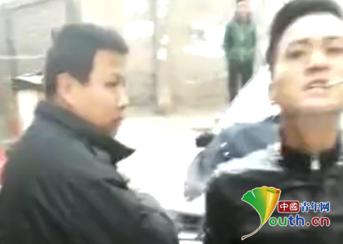 視頻中,與幾名穿黑衣制服男子一同出現(xiàn)的還有一輛沒(méi)有牌照、車門上印有“城管”字樣的車輛。在這段48秒的視頻中,一位身穿黑色制服的男子口出污言穢語(yǔ)近十次,并兩次上前推打視頻拍攝者。