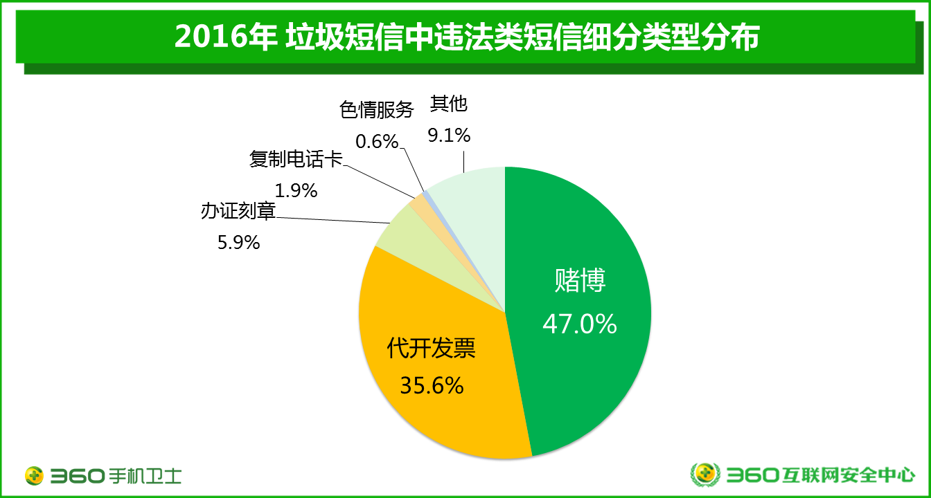 而在違法類(lèi)垃圾短信中,賭博類(lèi)短信的占比最高,為47.0%,其次為代開(kāi)發(fā)票類(lèi)垃圾短信35.6%、辦證刻章(5.9%)、復(fù)制電話卡(1.9%)、色情信息(0.6%)。相較于往年,代開(kāi)發(fā)票的短信有所減少,但賭博類(lèi)依然保持“第一陣營(yíng)”。