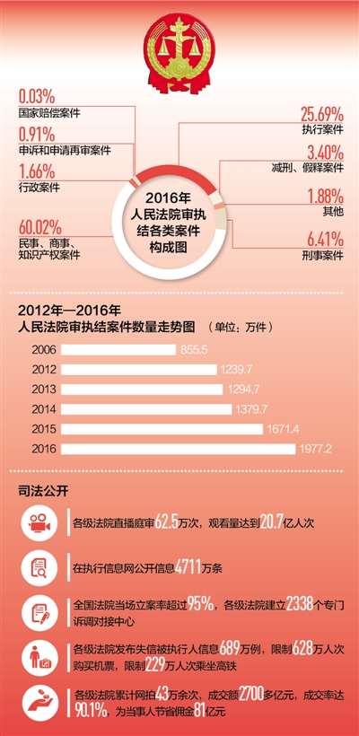 2016年,各級法院向執(zhí)行難全面宣戰(zhàn),共受理執(zhí)行案件614.9萬件,執(zhí)結507.9萬件,同比分別上升31.6%和33.1%,執(zhí)行到位金額1.5萬億元,同比上升54%。與公安部等10多個部門建立網(wǎng)絡執(zhí)行查控系統(tǒng),執(zhí)行法官足不出戶即可依法查詢被執(zhí)行人財產(chǎn)和相關信息,實現(xiàn)了執(zhí)行模式的根本變革。發(fā)布失信被執(zhí)行人信息689萬例,限制628萬人次購買機票,限制229萬人次乘坐高鐵。依法懲治拒不執(zhí)行裁判行為,司法拘留1.6萬人,追究刑事責任2167人,讓司法裁判真正成為懲治違法失信的利劍。