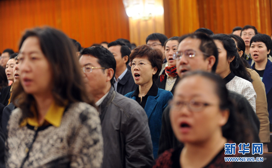 2016年10月21日,紀念紅軍長征勝利80周年大會在人民大會堂舉行。圖為全體起立唱國歌。新華網(wǎng) 陳競超 攝