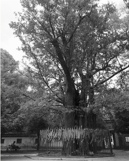 記者專程去西湖邊的五云山,去看山頂那棵杭州最古老的樹,1400多年的銀杏。爬上山,在山頂一眼望過去,就是那棵古老的銀杏,四周圍欄上系滿了紅色的祈福飄帶。20多米高的樹干和巨大的樹冠讓樹蔭下乘涼的人顯得很小。樹后面就是真際寺,里面小賣部的老板說,天天都有人跑來看這棵樹,再等幾個月,秋天銀杏葉黃的時候,別提多好看了。