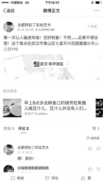 上車后,在確認(rèn)自己已經(jīng)安全的情況下,小王拿出手機(jī),在微博上@青山公安110舉報了該傳銷窩點,并提供了青山區(qū)和平大道附近該小區(qū)的定位。