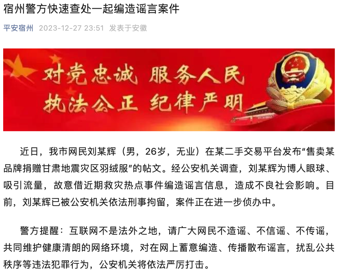 人民網(wǎng)北京12月28日電 (梁秋坪、高清揚(yáng))12月27日,安徽省宿州市公安局通報(bào),近日,該市網(wǎng)民劉某輝(男,26歲,無業(yè))在某二手交易平臺(tái)發(fā)布“售賣某品牌捐贈(zèng)甘肅地震災(zāi)區(qū)羽絨服”的帖文。