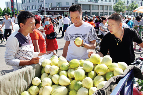 5 月29 日,原平市王家莊鄉(xiāng)弓家莊村的農民正在農貿市場銷售大棚香瓜、蔬菜。近年來,該市加大財政扶持力度,加快產業(yè)結構調整,大力發(fā)展蔬菜大棚。目前,該村戶均1座大棚,人均產值1.5 萬元。(褚震 攝)