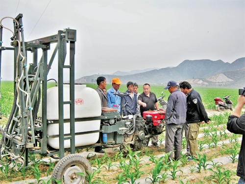 在五臺(tái)縣茹村鄉(xiāng)農(nóng)機(jī)化示范區(qū),廠方技術(shù)員正在對(duì)農(nóng)機(jī)具操作手進(jìn)行技術(shù)培訓(xùn),該示范區(qū)推廣應(yīng)用了中農(nóng)(北京)豐茂植保機(jī)械有限公司生產(chǎn)的3WX—400G 型自走式高稈作物噴稈噴霧植保機(jī)械,提升了玉米生產(chǎn)機(jī)械化程度。(鄭素平 攝)
