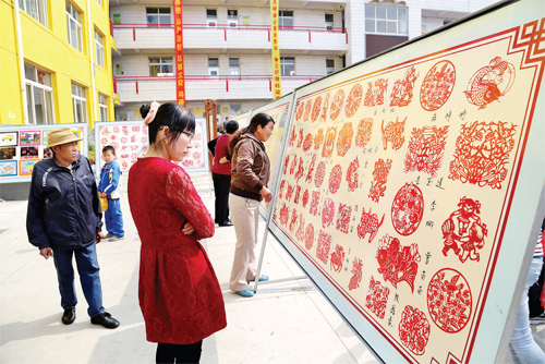 近日,靜樂縣利民小學(xué)舉辦校園書法、繪畫和剪紙作品展。據(jù)悉,此次活動(dòng)共收到美術(shù)作品300 余件、書法作品300 余件、剪紙作品600 件。通過一件件作品表達(dá)了孩子們對美麗“中國夢”的憧憬。圖為學(xué)生和家長在參觀展覽。(閆曉梅 攝)