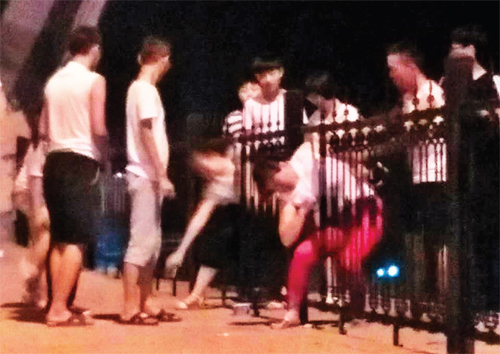 8月9日晚21點(diǎn)左右,在城區(qū)云中河景區(qū)游園乘涼的市民依然絡(luò)繹不絕。一群十五六歲學(xué)生模樣的青年將幕山橋上的鐵柵欄分開(kāi),一個(gè)個(gè)鉆過(guò)隔離欄魚(yú)貫而出,引來(lái)橋上欣賞夜景的市民們一片譴責(zé)之聲。