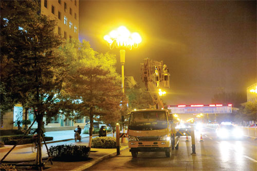路燈檢修工人穿好工作服,戴上安全帽,登上搶修車的工作臺,對路燈、接線箱、燈桿等照明設(shè)施進行了全面細致的檢查、維護、更換。10月26日9時許,記者在我市城區(qū)長征路上看到,市政公司組織工人冒著凜冽的寒風,正在對道路兩旁損壞的路燈進行更換,確保夜幕下城區(qū)的每一盞路燈都能夠正常照明。圖為工人師傅正在長征路上對損壞的路燈進行更換。(張志遠 王菲 攝)