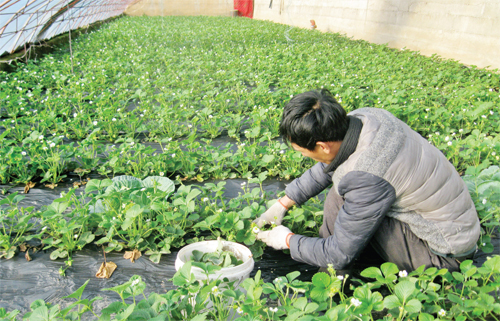 河曲縣農(nóng)民孫寶元利用日光大棚技術(shù)開展冬季草莓種植,3座日光大棚安排種植了早、中、晚熟三個(gè)品種。早熟品種將在新年開園,光是頭茬就預(yù)計(jì)能賣1萬元,草莓種植帶他駛?cè)肓酥赂坏目燔嚨馈?span style="font-family: 楷體,楷體_gb2312, simkai">圖為孫寶元正在大棚修剪草莓。(賈金理 攝)