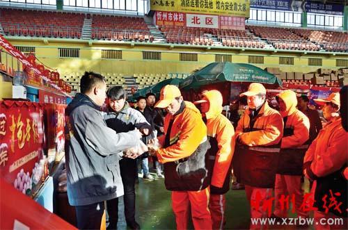 1月19日上午,山西熊奪寶網(wǎng)絡(luò)科技有限公司面向忻州市環(huán)衛(wèi)系統(tǒng)開展“獻(xiàn)愛心迎佳節(jié)”活動(dòng),來(lái)自忻州市市容環(huán)境衛(wèi)生管理處的50名環(huán)衛(wèi)工人代表,每人領(lǐng)到了一份新鮮雞蛋?,F(xiàn)場(chǎng)的一位工作人員告訴記者:“環(huán)衛(wèi)工人們?yōu)榱顺鞘械母蓛粽麧嵏冻隽诵燎诘暮顾?,希望這些雞蛋能為他們補(bǔ)補(bǔ)身體。除現(xiàn)場(chǎng)領(lǐng)取雞蛋的50名環(huán)衛(wèi)工人之外,我市另外的1000多名環(huán)衛(wèi)工人也將陸續(xù)領(lǐng)到愛心雞蛋?!鳖I(lǐng)到雞蛋的環(huán)衛(wèi)工李大姐高興地說(shuō):“今年過(guò)年雞蛋也不用買了,實(shí)在是太好了!”(王菲 郭劍鳴 攝)